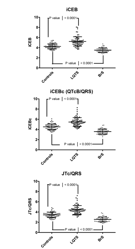 - LQTS 患者的 iCEB 更高,而 Brugada 患者更低。